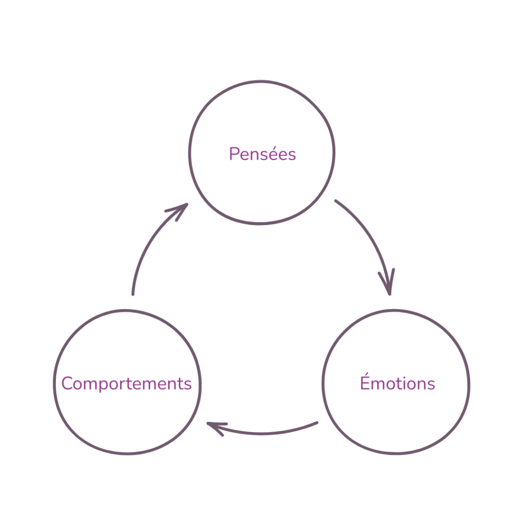 Sur ce schéma, tu retrouves trois composantes qui sont en interaction les unes avec les autres: tes pensées, tes émotions et tes comportements.